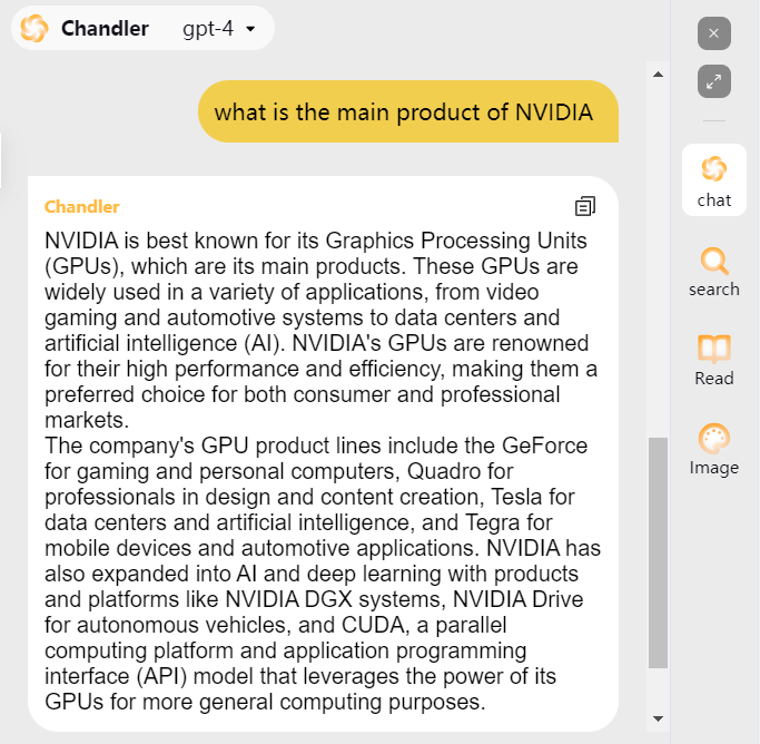 ChandlerAi aims to be the best AI assistant for users, based on OpenAI's most advanced ChatGPT-4 model. Whatever problems ChatGPT-4 can solve, ChandlerAi can also solve.